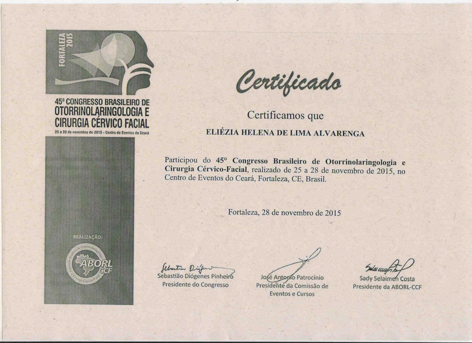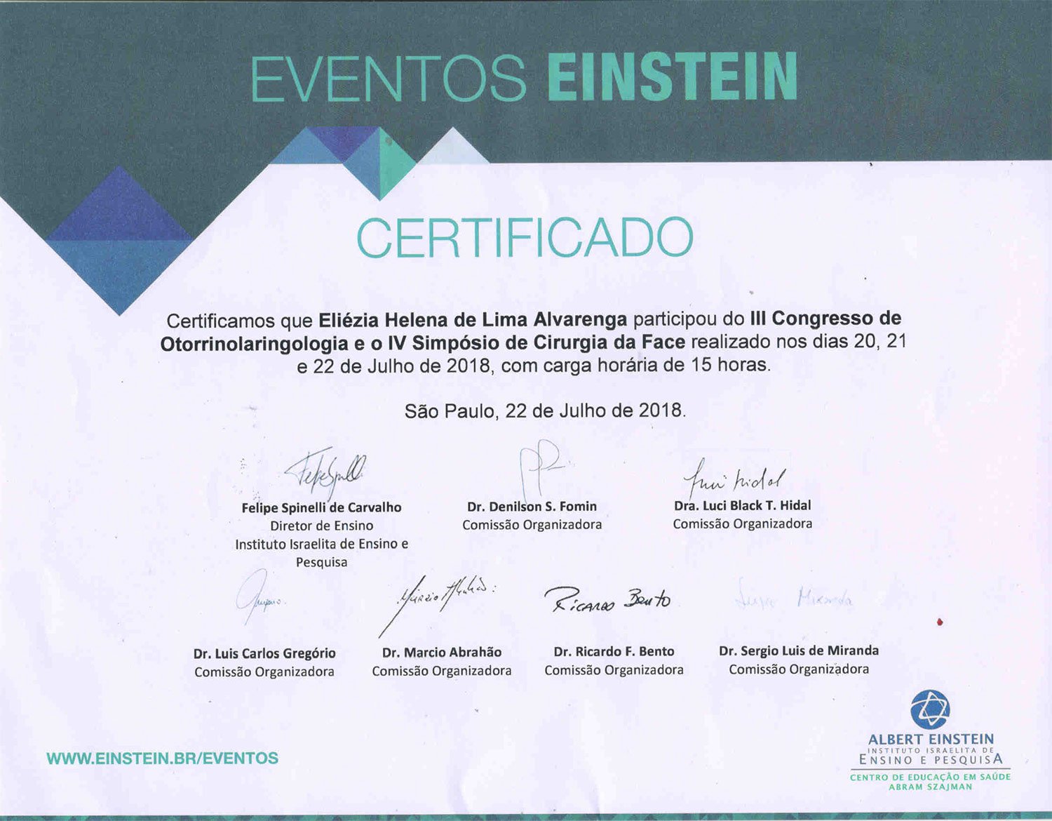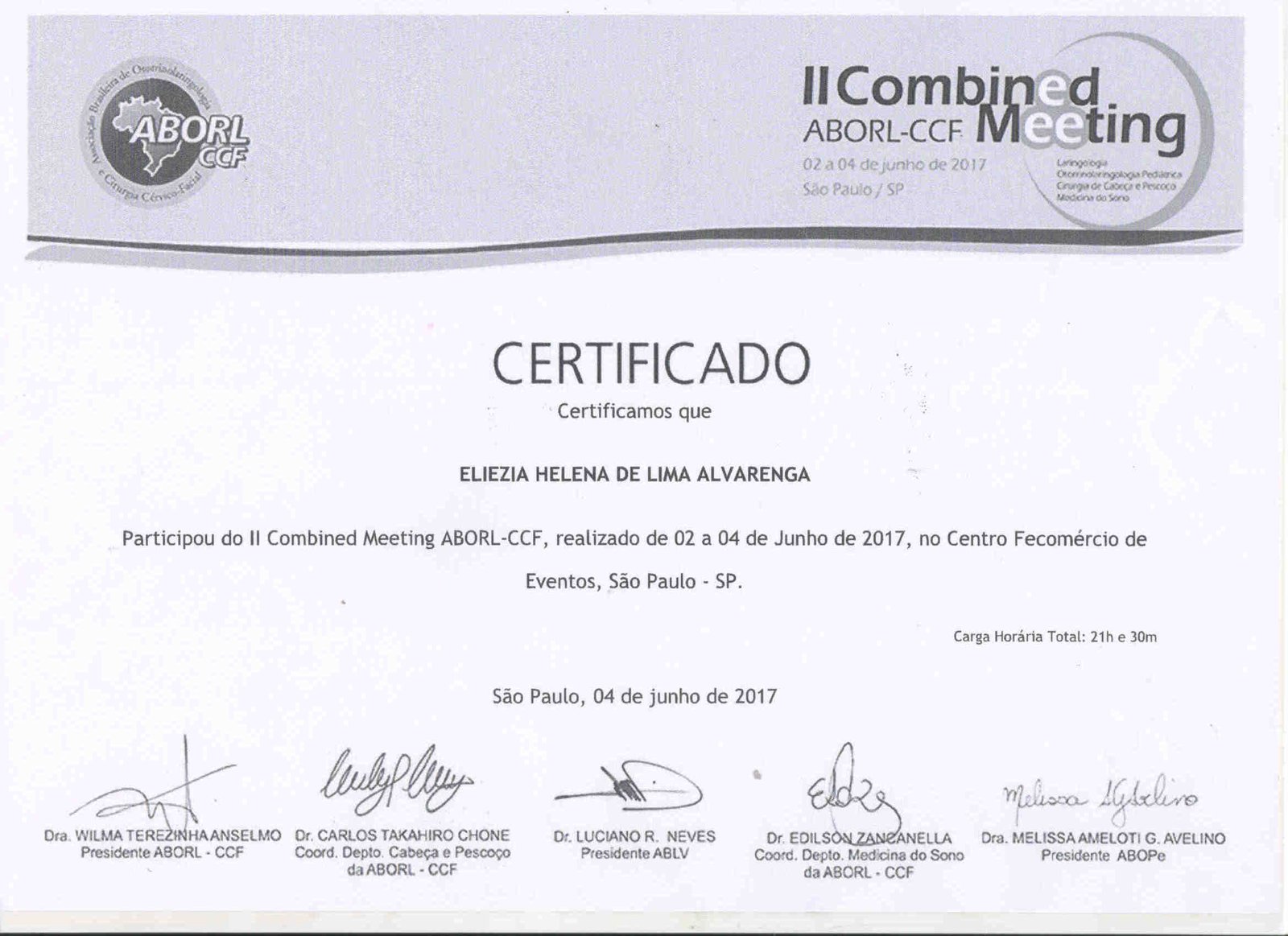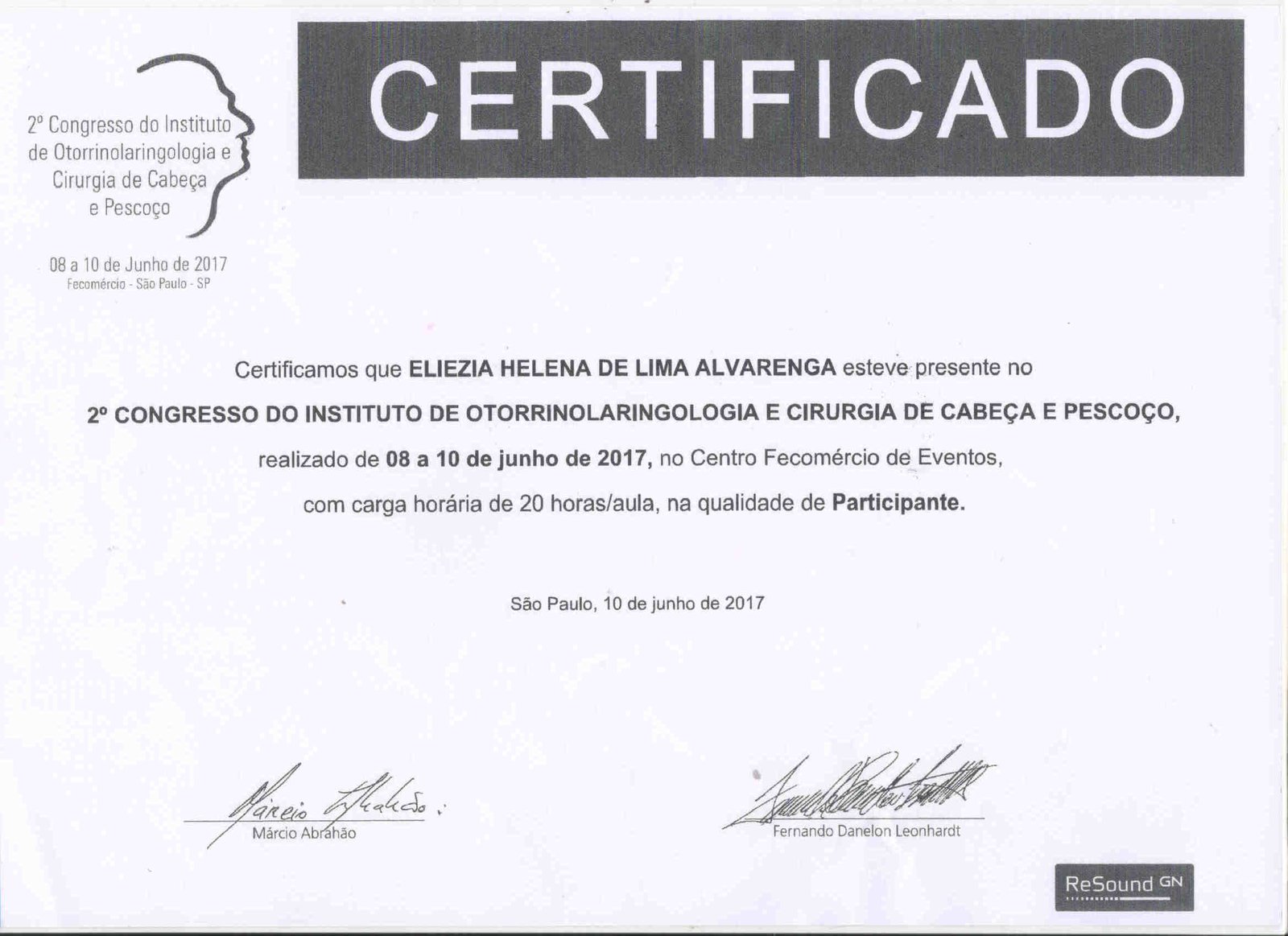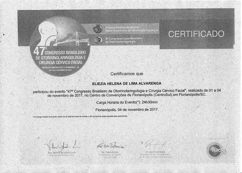 - 2017 – Participação no 2º Congresso do Instituto de Otorrinaringologia e Cirurgia de Cabeça e Pescoço (certificado)