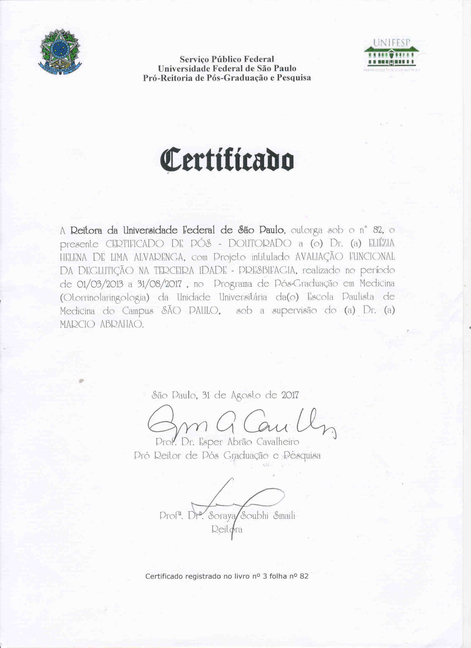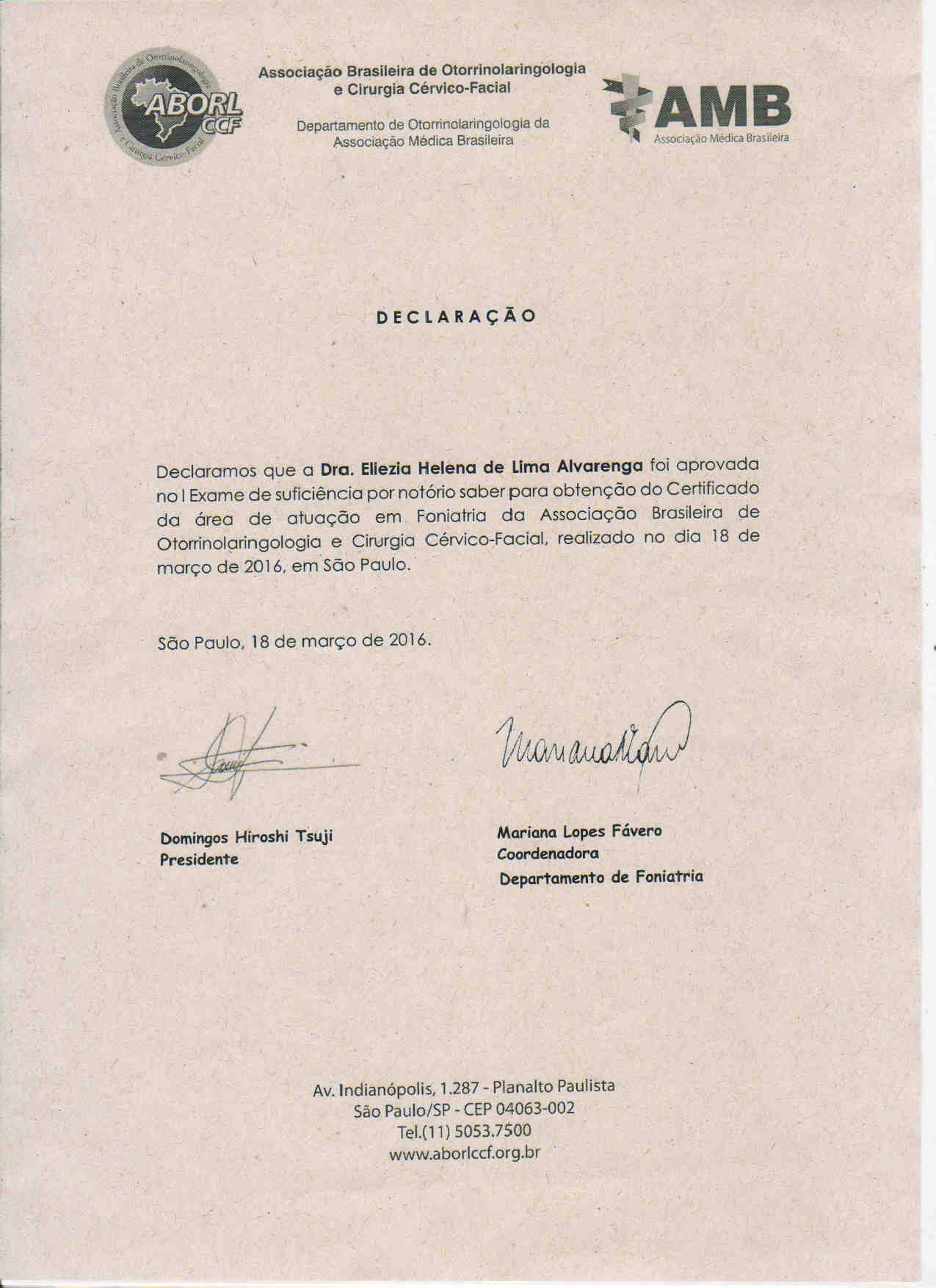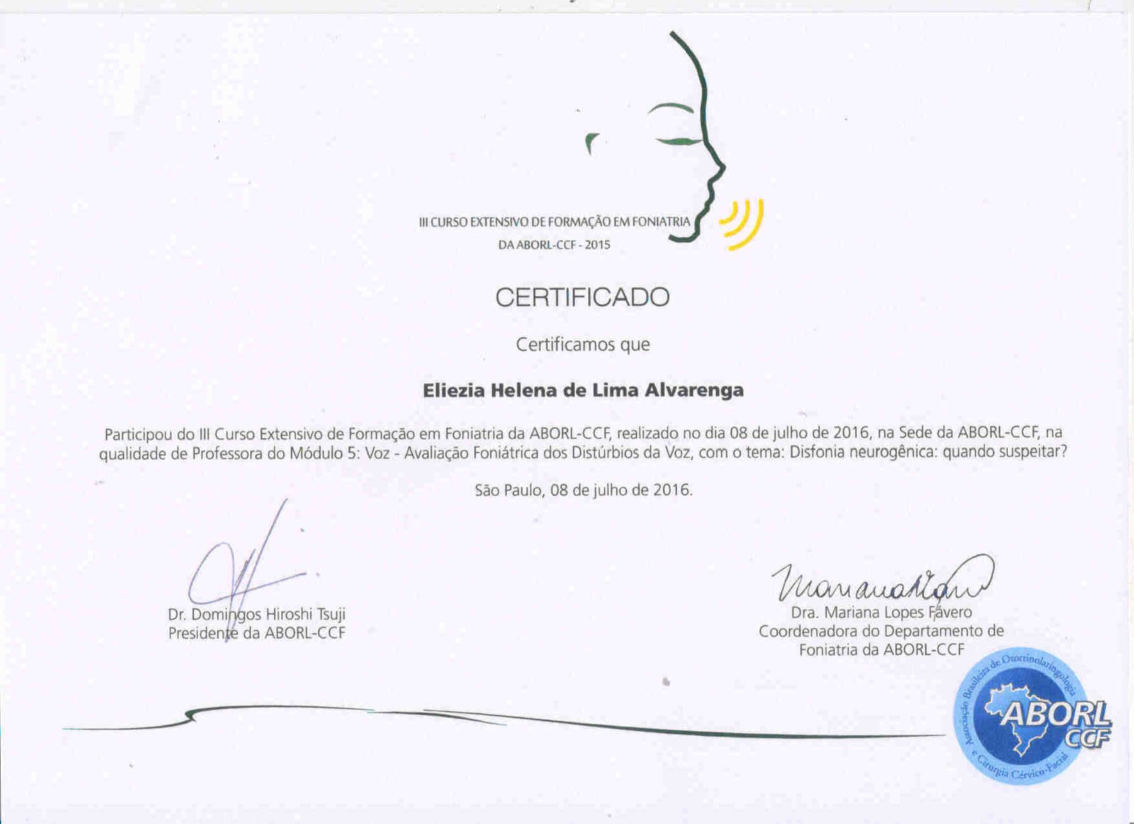 - 2016 – Certificado de atuação em Foniatria da Associação Brasileira de Otorrinolaringologia e Cirurgia Cérvico-Facial (certificado)