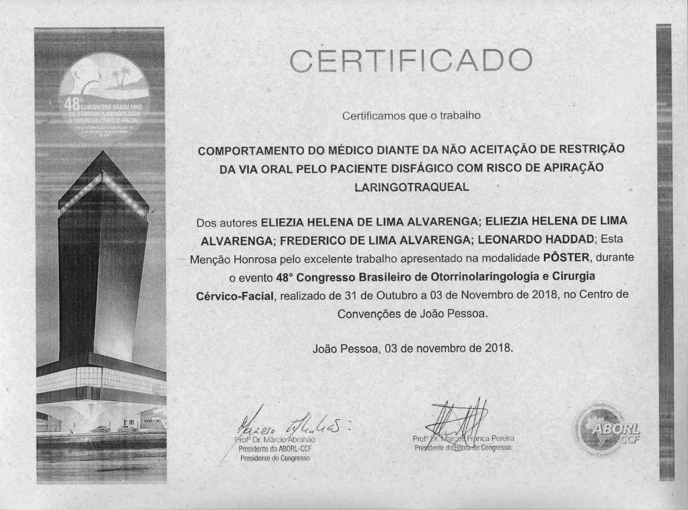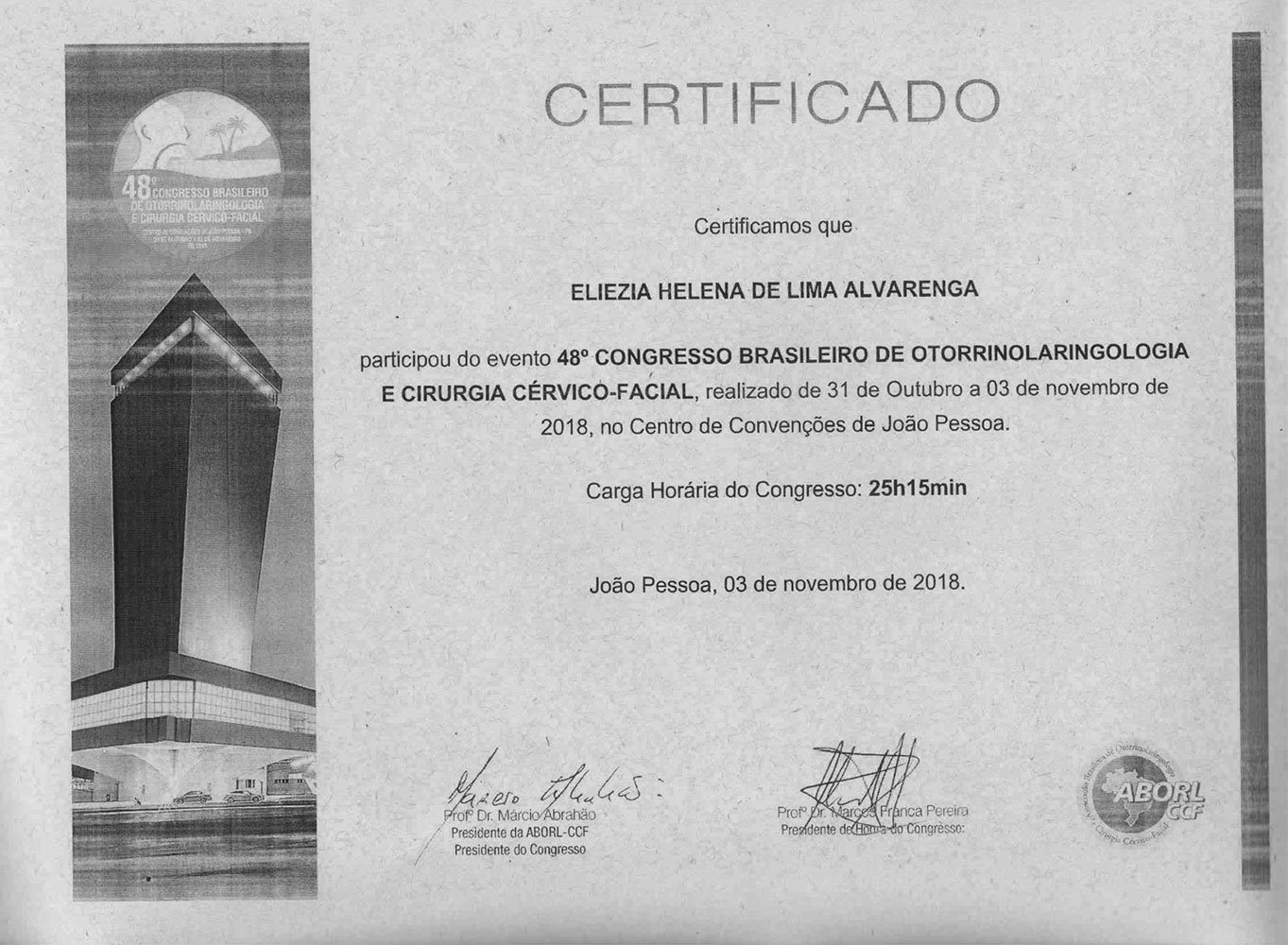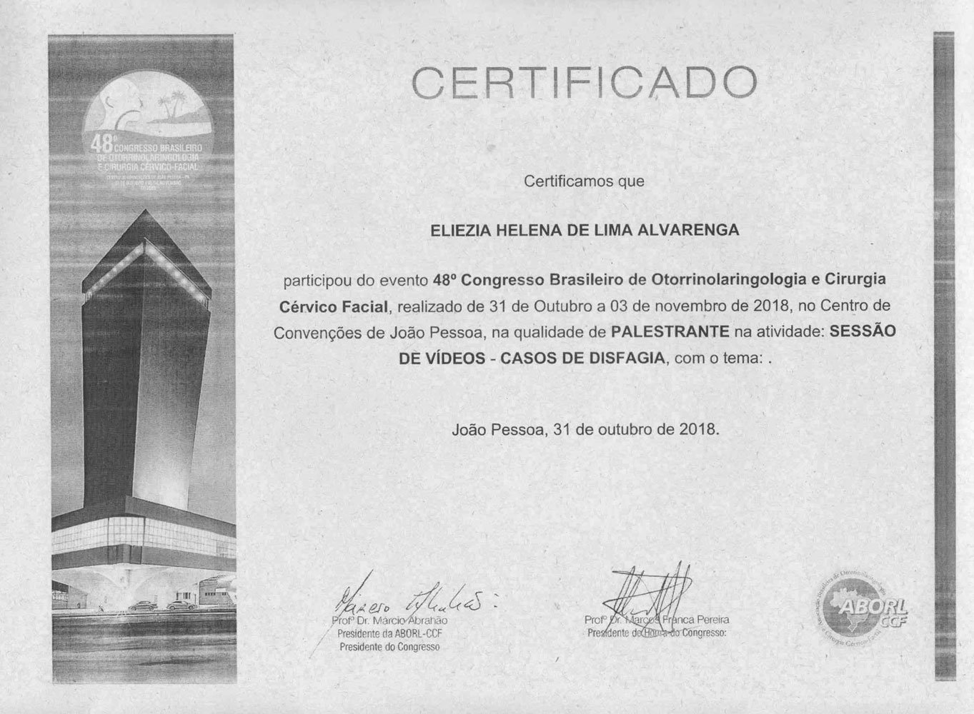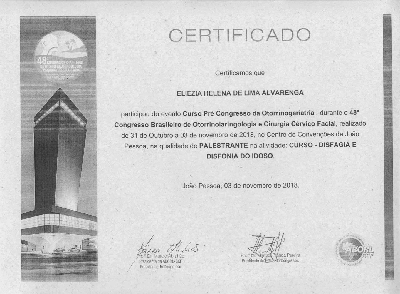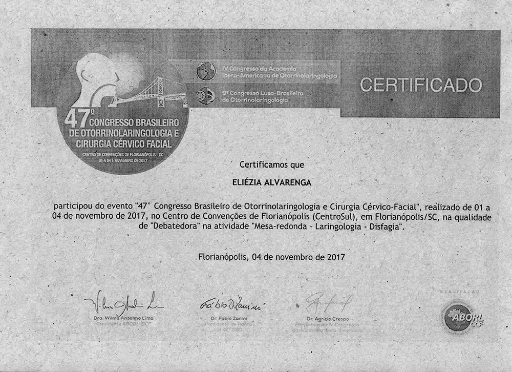 - 2018 – Participação do 48º Congresso Brasileiro de Otorrinolaringologia e Cirurgia Cérvico Facial, em João Pessoa, de 31 de outubro a 3 de novembro de 2018; e palestrante do curso Disfagia e Disfonia no Idoso do Pré Congresso da Otorrinogeriatria (certificados 1, 2, 3, 4).