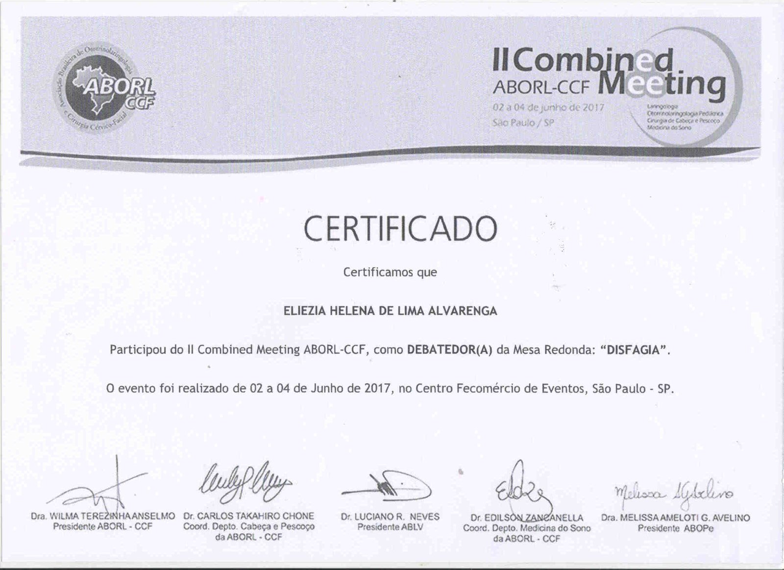 - 2017 – Participação do IV Curso Extensivo de Foniatria ABORL-CCF como palestrante e debatedor de mesa redonda (certificados 1, 2 e 3).