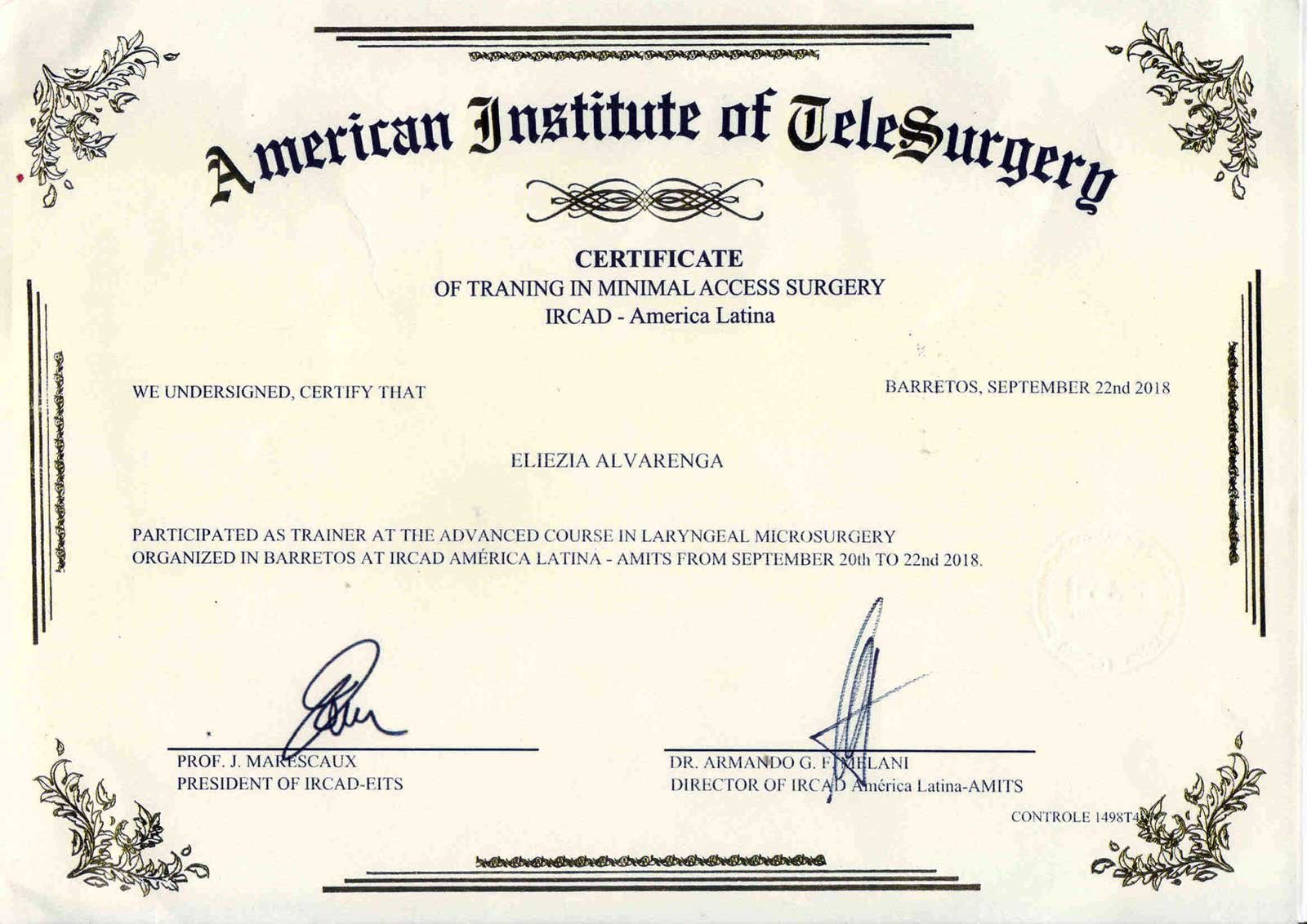 - 2018 – Participação como palestrante do Advanced Course in Laryngeal Microsurgery, organizado pelo IRCAD América Latina, de 20 22 de setembro de 2018 (certificado).