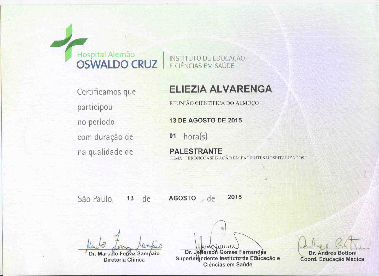 - 2015 – Palestrante na reunião científica do Hospital Oswaldo Cruz de 13 de agosto e 2015, com o tema: “Broncoaspiração em pacientes hospitalizados” (certificado)