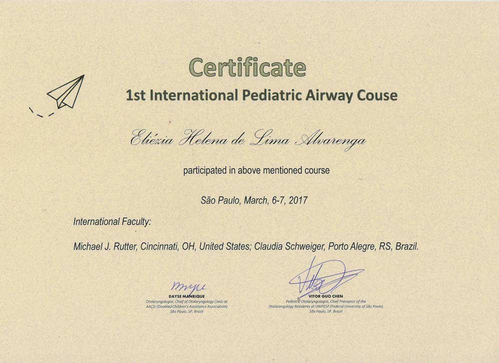 - 2017 – Participação no 1º International Pediatric Airway Course (certificado)