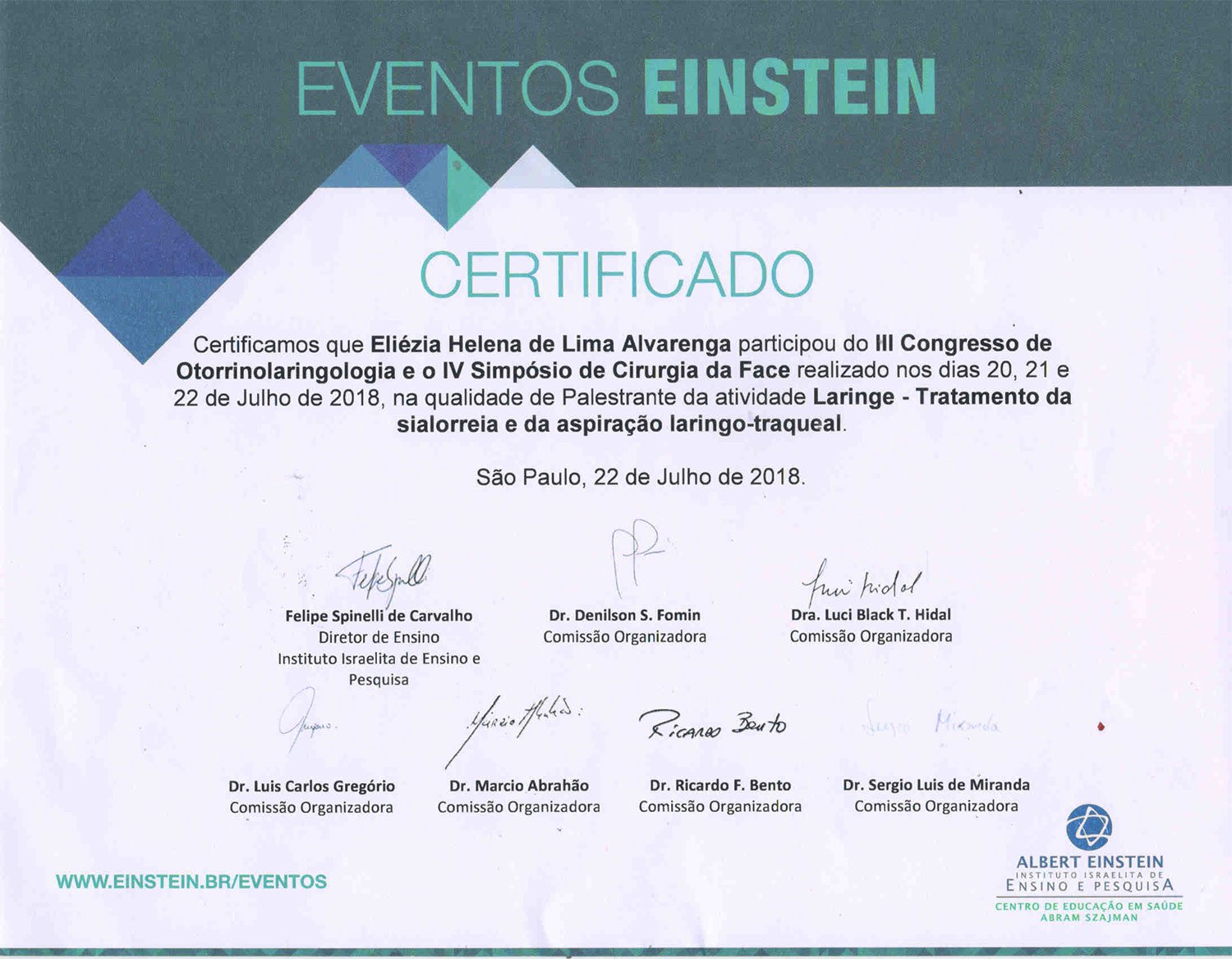 - 2018 – Participação do III Congresso de Otorrinolaringologia e IV Simpósio de Cirurgia da Face, na qualidade de palestrante: Laringe – Tratamento da sialorreia e da aspiração laringo-traqueal (certificados 1, 2)