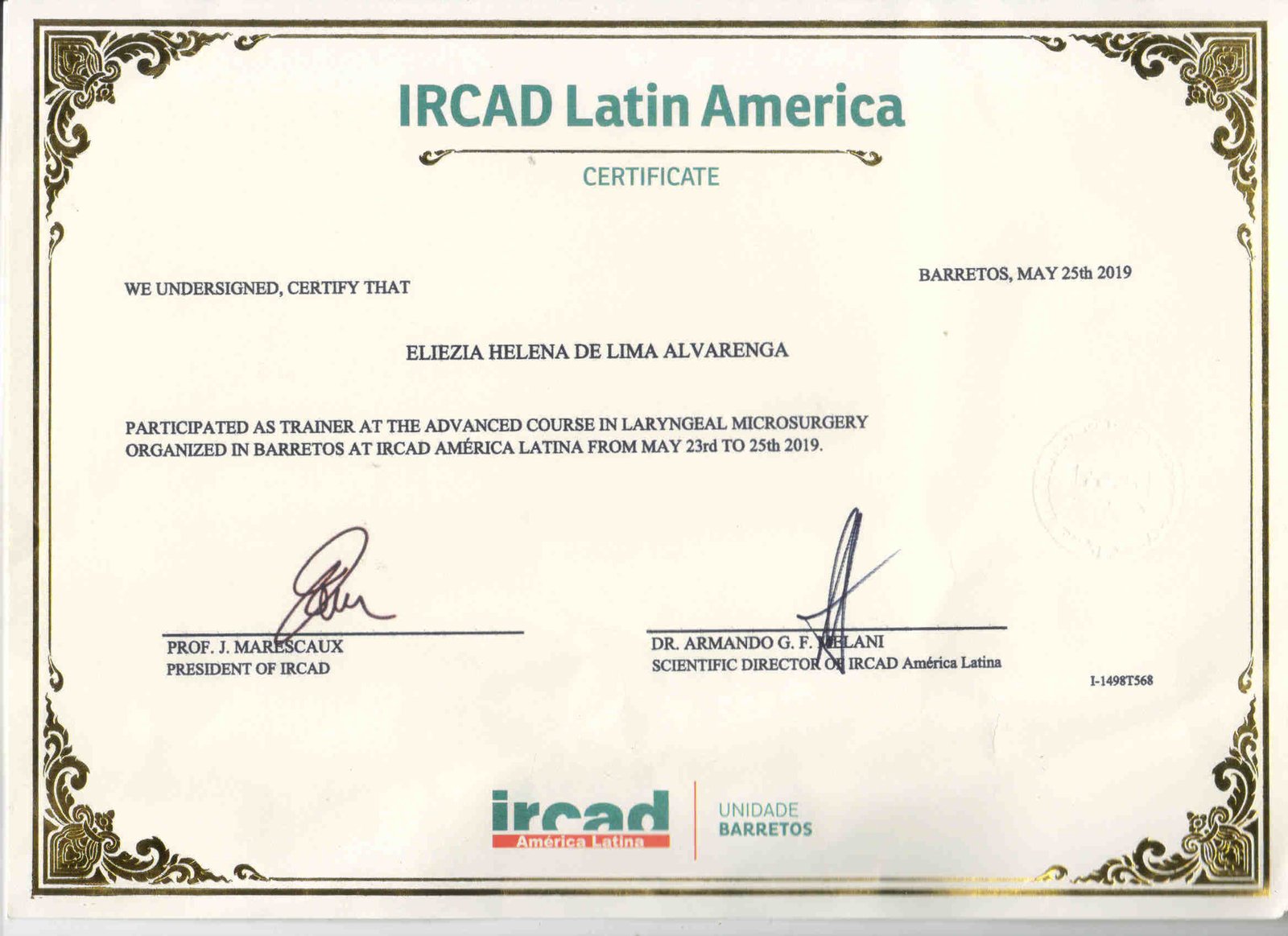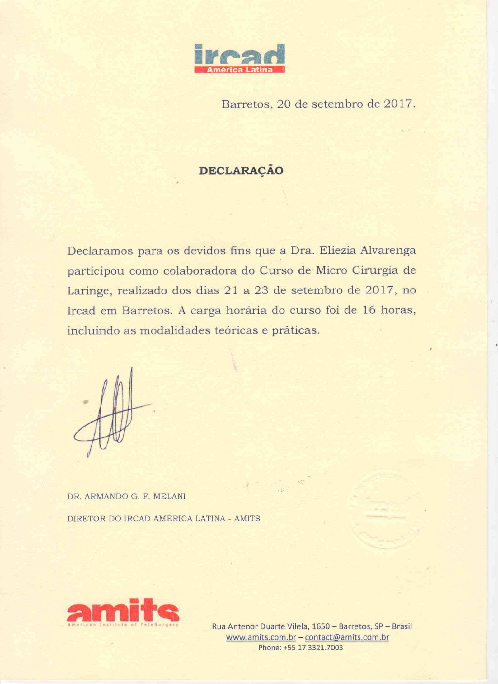 - 2017 – Participação como colaboradora no Curso de Micro Cirurgia de Laringe, do Ircad, de 21 a 23 de setembro de 2017 (certificado).