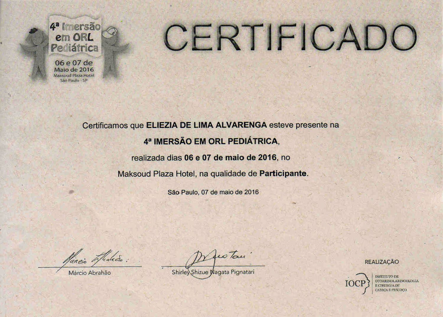 - 2016 – Participação da 4ª Imersão em ORL Pediátrica, realizada pelo IOCP (certificado)