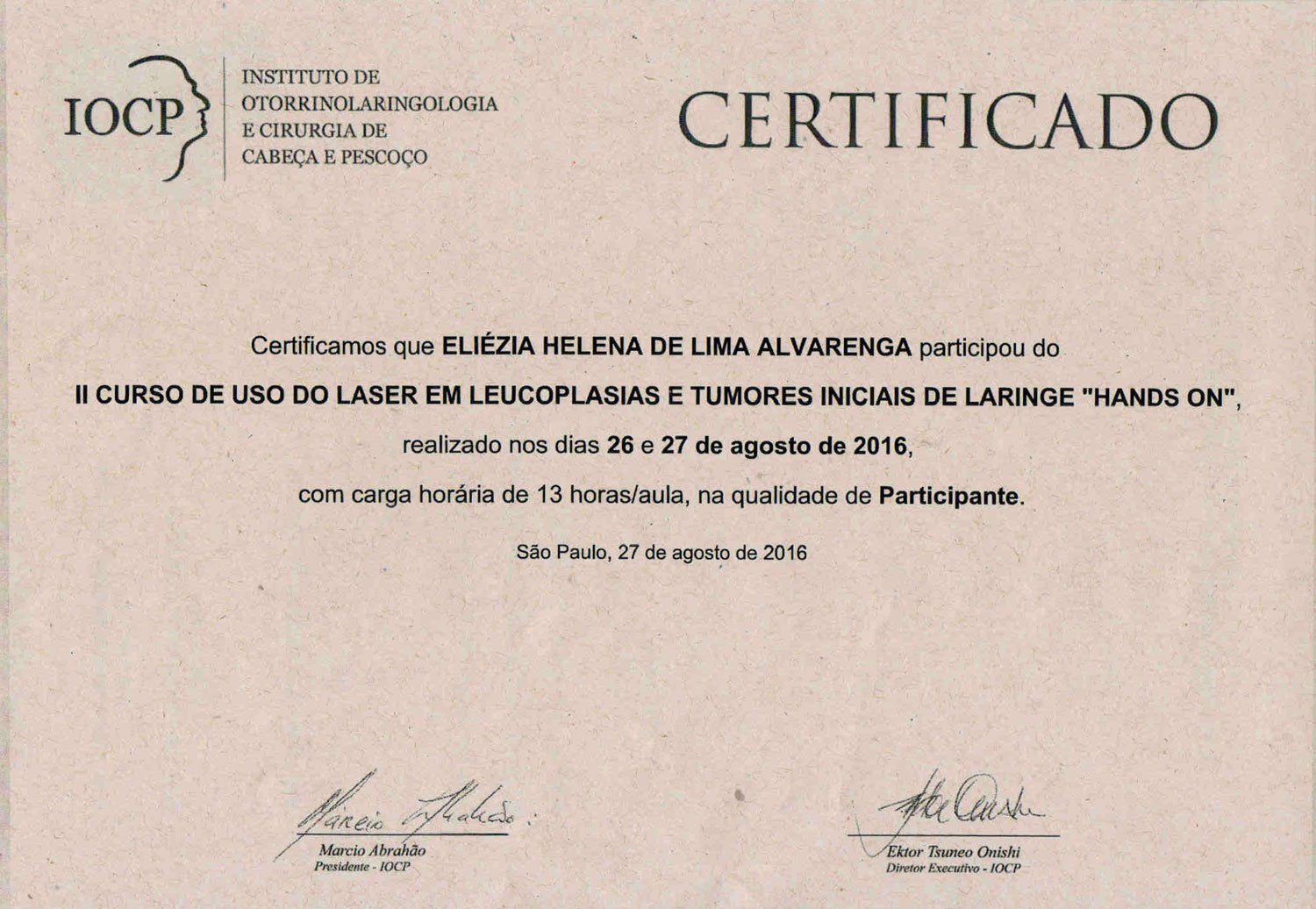 - 2016 – Participação no II Curso de uso do laser em leucoplasias e tumores iniciais de laringe “hands on”, promovido pelo IOCP (certificado)