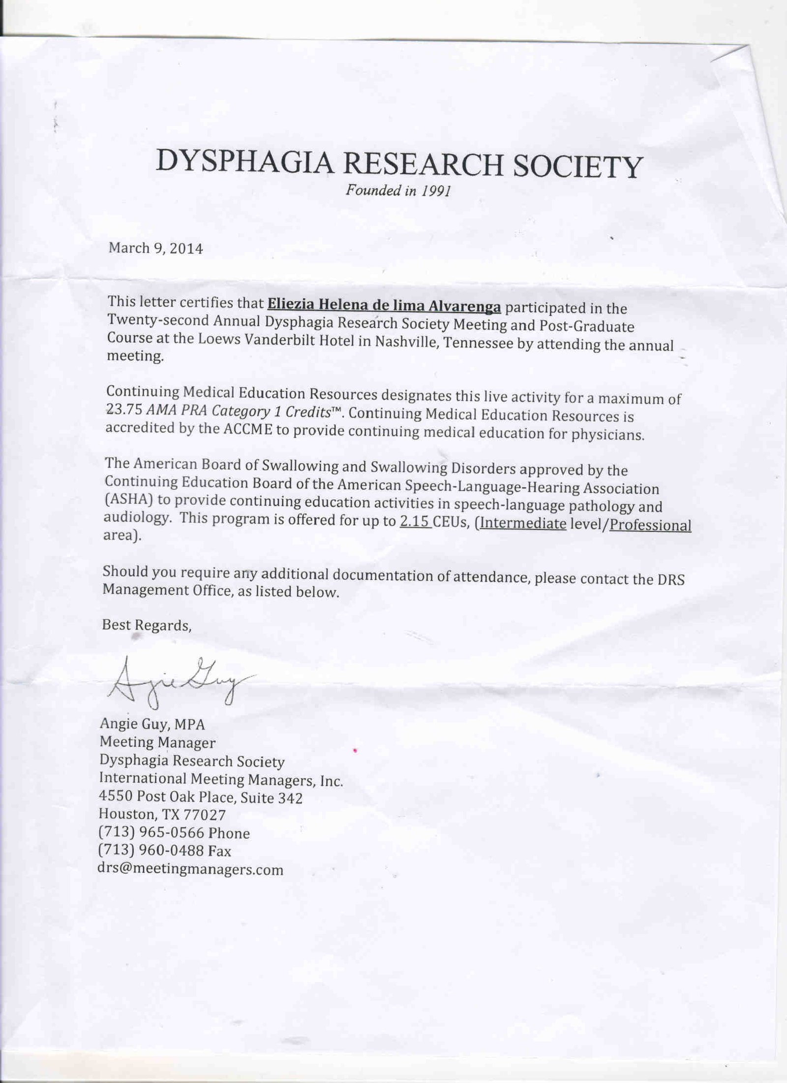 - 2014 – 22º Annual Dysphagia Research Socity Meeting and Pos-Graduate Course, em Tennessee, EUA (certificado)