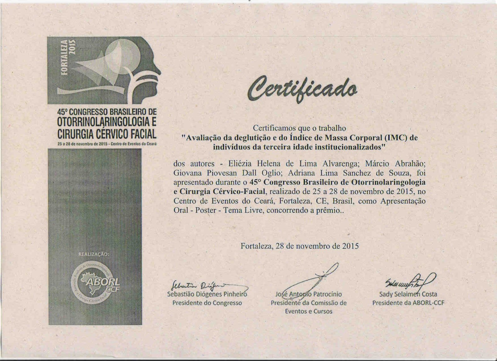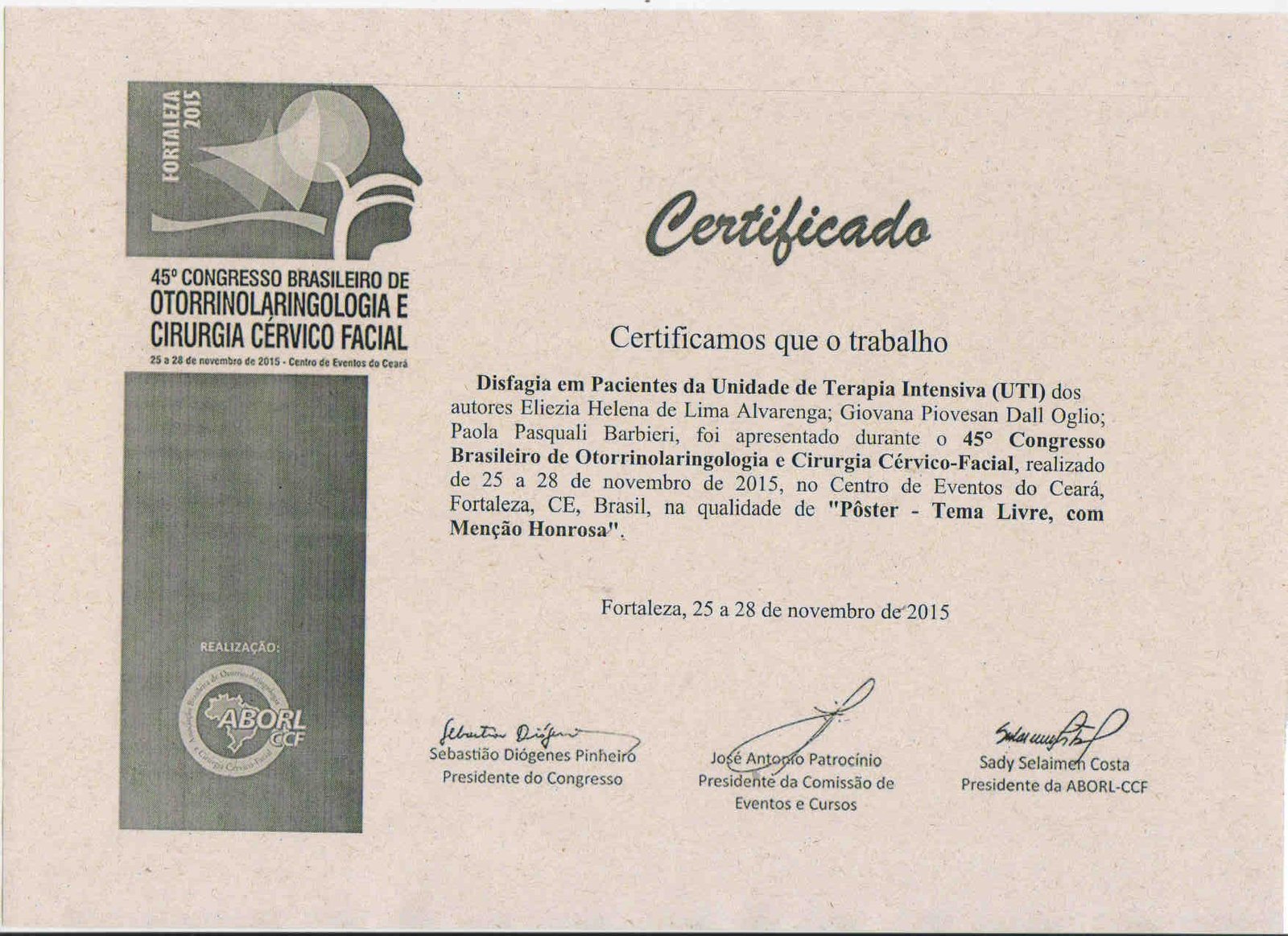 - 2015 – Congresso Brasileiro de Otorrinolaringologia e Cirurgia Cérvico Facial (certificado), tendo apresentado os trabalhos “Disfagia em pacientes da unidade de terapia intensiva” (menção honrosa); e “Avaliação da deglutição e do índice de massa corporal de indivíduos da terceira idade institucionalizados” (certificado)
