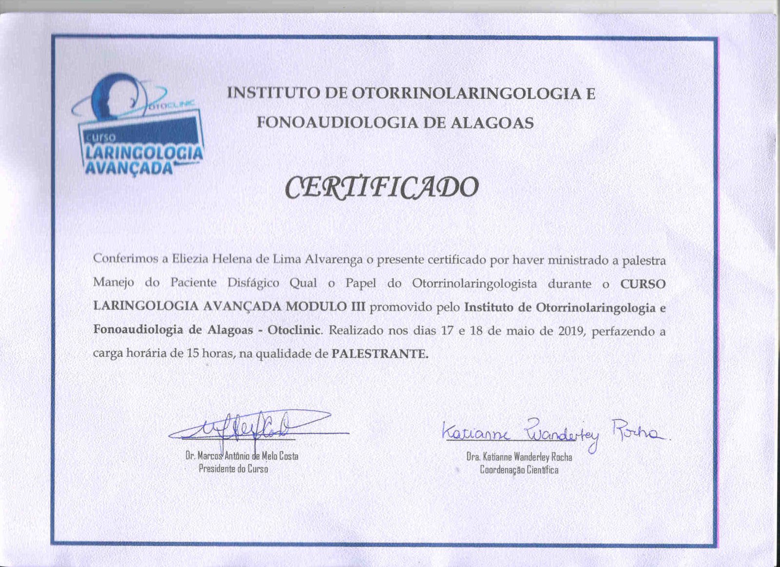 - 2019 – Palestrante do curso Laringologia avançada módulo III, promovido pelo Instituto de Otorrinolaringologia e Fonoaudiologia de Alagoas, realizado nos dias 17 e 18 de maio de 2019 (certificado).