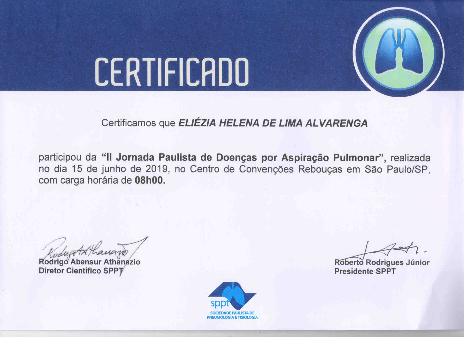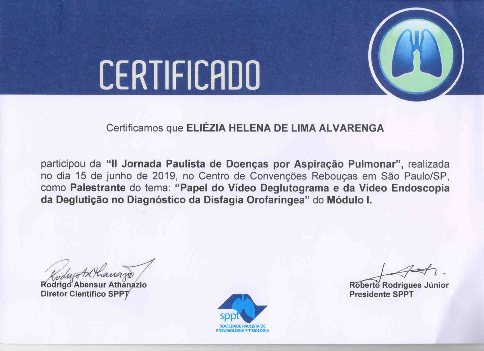 - 2019 – Participação da “II Jornada Paulista de Doenças por Aspiração Pulmonar”, promovida pela Sociedade Paulista de Pneumologia e Tisiologia no dia 15 de junho de 2019 (certificado), e palestrante do módulo 1 com o tem “papel do Vídeo Deglutograma e da Vídeo Endoscopia da Deglutição no Diagnóstico da Disfagia Orofaríngea” (certificado).