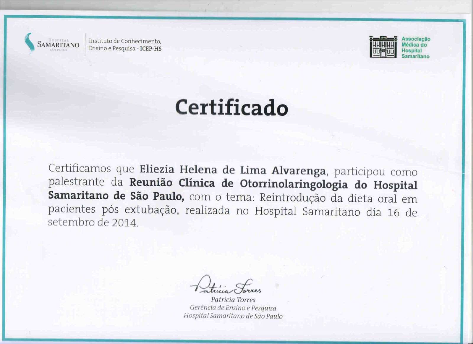 - 2014 – Palestrante da Reunião Clínica de Otorrinolaringologia do Hospital Samaritano de São Paulo, realizada em setembro de 2014 (certificado).